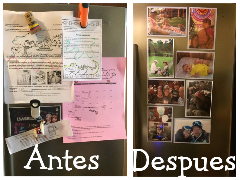 La cocina es el corazón de la casa, el primer lugar  al que voy en la mañana, el último al que voy antes de dormir (por el vasito de agua;).  Hago ahí la comida y preparo algo para  refaccionar (merendar) a media tarde. Paso muchas horas en ese espacio, al cual no le he dedicado tanta atención como a otros lugares de la casa.  Por eso decidí poner un poco de orden, empezando por el refrigerador, que lo había convertido en una especie de agenda, centro de control, donde con imanes, pegaba: el calendario y cuanto papelito (enviar un tubo de papel de baño para el viernes etc.) mandan del colegio, invitaciones para piñatas, volantes o cualquier información que necesito tener a la mano para acordarme.