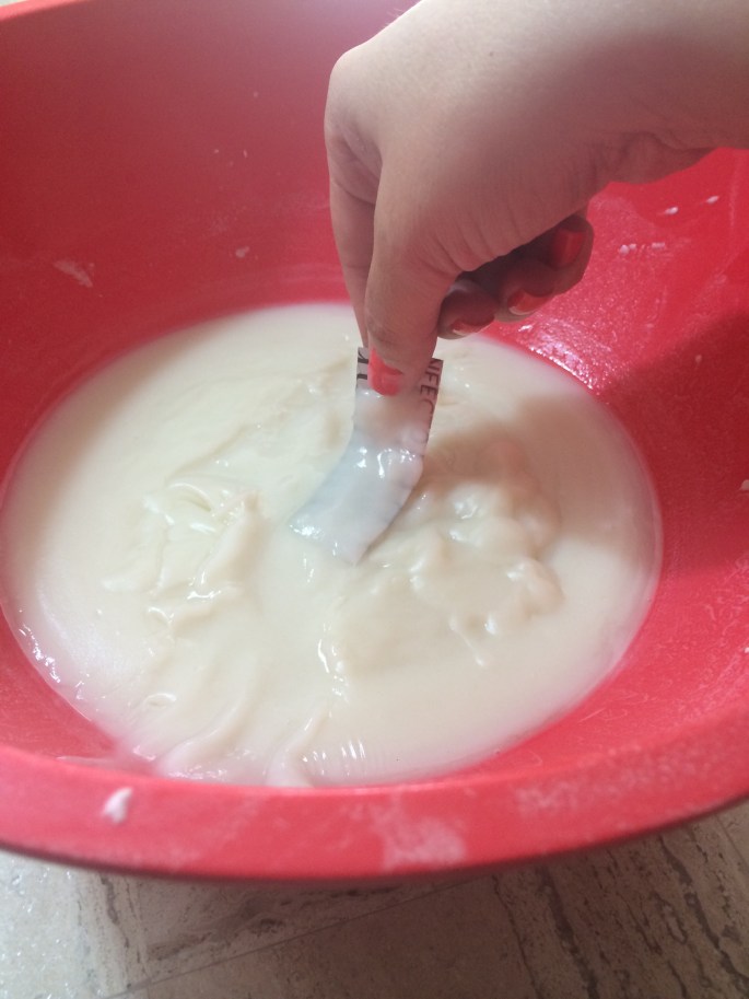 1.- Agregar el colorante al agua, debe de quedar intenso el color porque cuando se agregan los ingredientes se difumina mucho el color.